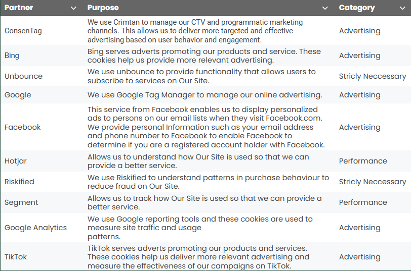 Here is a breakdown of cookies we use, what they are used for: