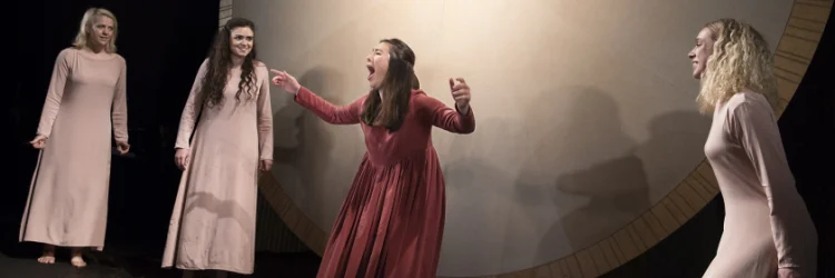 Being a kid in medieval Germany was no day at the beach, especially if you were Hildegard von Bingen. The youngest among 10 siblings, her parents sacrificed her to the Catholic Church when she was eight, and she spent the next 30 years locked away in a dark cell. She would emerge, circa 1136, to become a devout nun as well as a gifted writer, composer, and botanist who also performed exorcisms and had Godly visions. Nearly 900 years later she was declared a saint. Perhaps sensing that Hildegard would not be the easiest human with which to identify, playwright, actor and songwriter Grace McLean, in her new musical In the Green, at Lincoln Center Theater's Claire Tow Theater, turns the tale inward. Focusing on those three decades removed from society, McLean, utilizing enrapturing orchestral techniques, poetics and a giant prop eyeball, deconstructs the girl's life, breaking her into pieces for our examination.