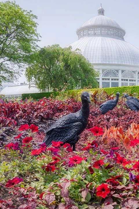 Patterson's work embraces the lush, colorful, and enticing elements of gardens while offering bold and provocative moments. Hundreds of glittering vultures descend like shadows to gather among wound-like ruptures in the landscape. Colorful plantings and ghostly cast glass sculptures represent extinct species that now exist only as specimens in NYBG’s Herbarium, serving as a reminder of what we stand to lose. Displays in the LuEsther T. Mertz Library feature an immersive video installation, woven tapestries, and paper works that continue Patterson’s artistic viewpoint on gardens and wild, uncultivated nature.