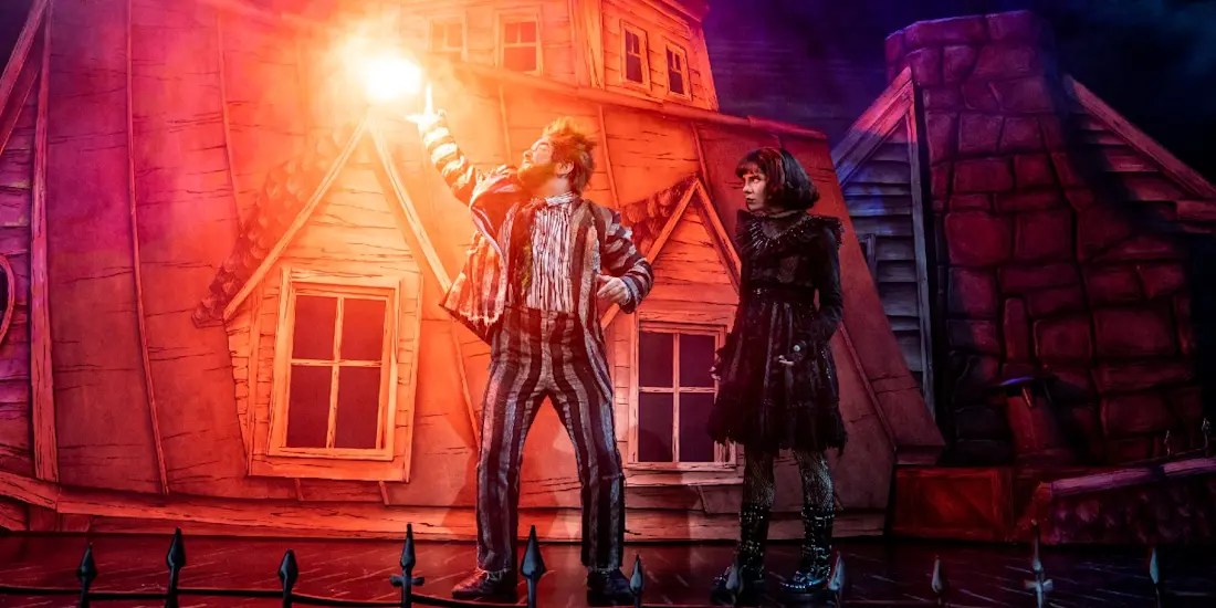 In the dark comedy musical, the "ghost with the most" Beetlejuice helps a timid, newly deceased suburban couple scare new tenants out of their old house. Along the way, he strikes up an unlikely friendship with the new tenants' daughter, the death-obsessed Lydia, and uses her in his own plan to come back to life and wreak havoc on the wider world. Learn more about how the Beetlejuice musical compares to and differs from the movie.