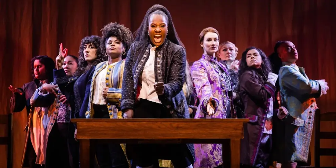 The all-female, transgender, and non-binary ensemble cast also includes Crystal Lucas-Perry as John Adams, Gisela Adisa as Robert Livingston, Nancy Anderson as George Read, Becca Ayers as Col. Thomas McKean, Tiffani Barbour as Andrew McNair, Allyson Kaye Daniel as Abigail Adams/Rev. Jonathan Witherspoon, Elizabeth A. Davis as Thomas Jefferson, Mehry Eslaminia as Charles Thomson, Joanna Glushak as Stephen Hopkins, Shawna Hamic as Richard Henry Lee, Eryn LeCroy as Martha Jefferson/Dr. Lyman Hall, Liz Mikel as John Hancock, Patrena Murray as Benjamin Franklin, Oneika Phillips as Joseph Hewes, Lulu Picart as Samuel Chase, Sara Porkalob as Edward Rutledge, Sushma Saha as Judge James Wilson, Brooke Simpson as Roger Sherman, Salome B. Smith as Courier, Sav Souza as Dr. Josiah Bartlett, and Jill Vallery as Caesar Rodney.